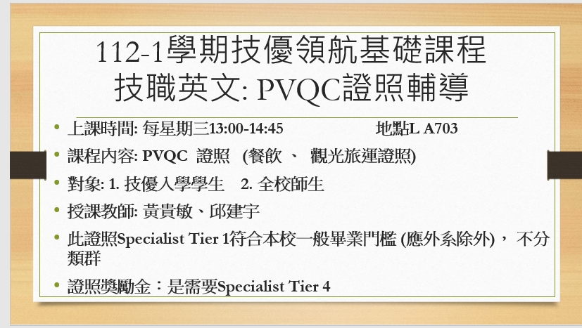 課程內容:PVQC證照(餐飲、觀光旅遊證照)